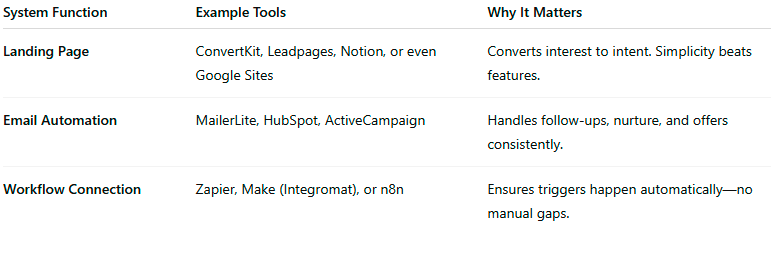 Use three core tools—landing page, email automation, workflow connector—and integrate them. Resist adding more until these run smoothly.