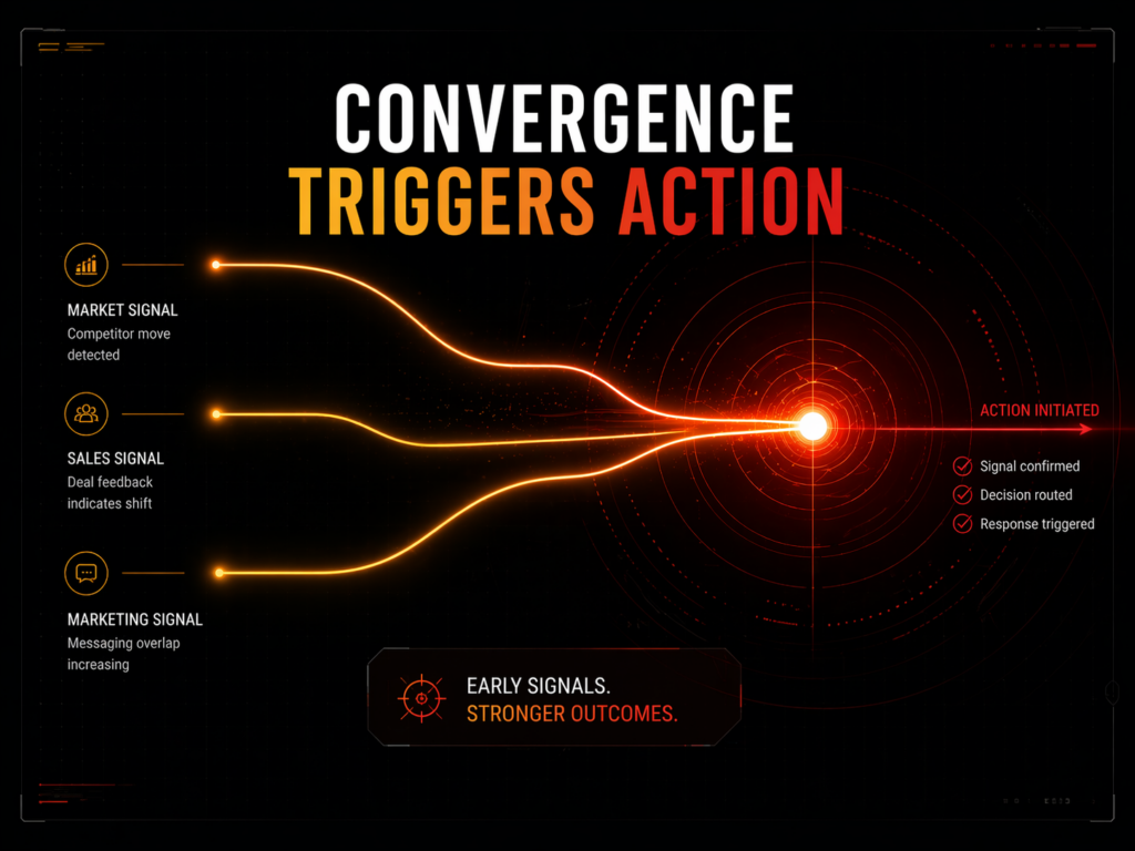 When a competitor shifts positioning, the system detects overlap early. When that shift begins to influence deal outcomes, thresholds are reached. When thresholds are met, response is triggered.