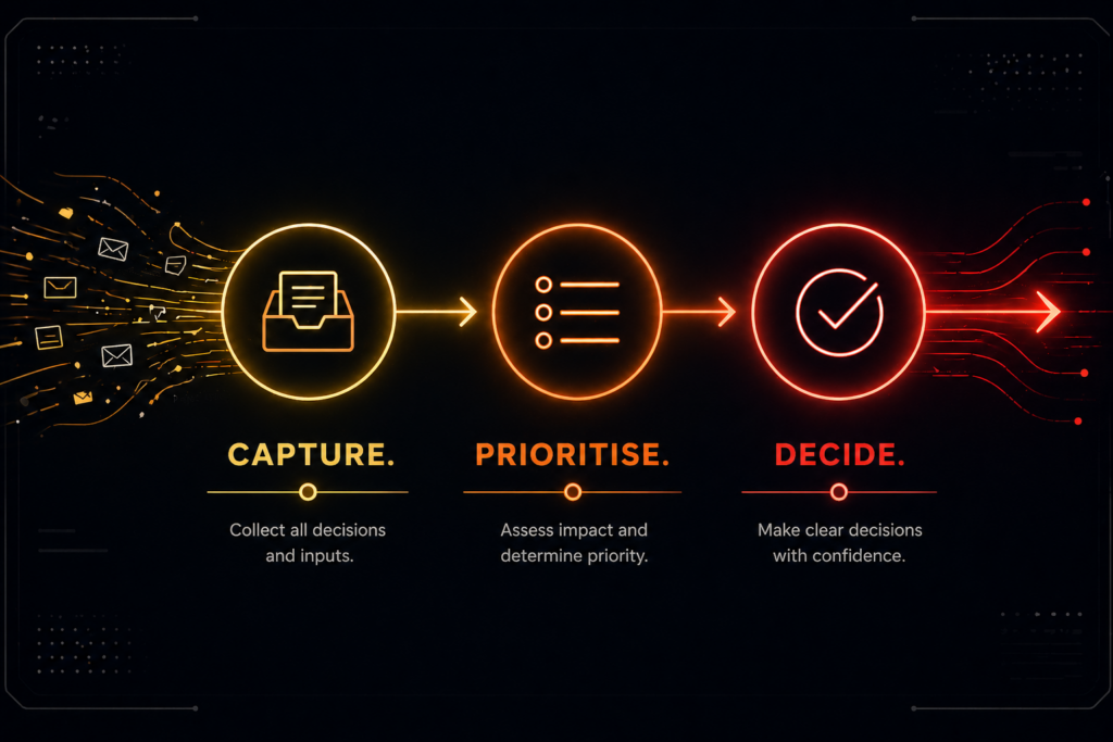Instead of reacting, you create a system where decisions are captured, staged, and resolved based on impact—not noise.